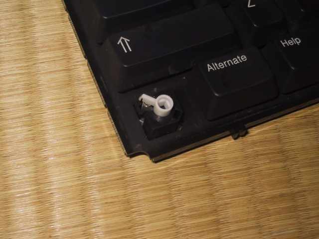 Caps Lockのキートップを外したところです。プッシュロックをオフにした状態ですが、元は白い軸の右下に銅の板が組み込まれていました。