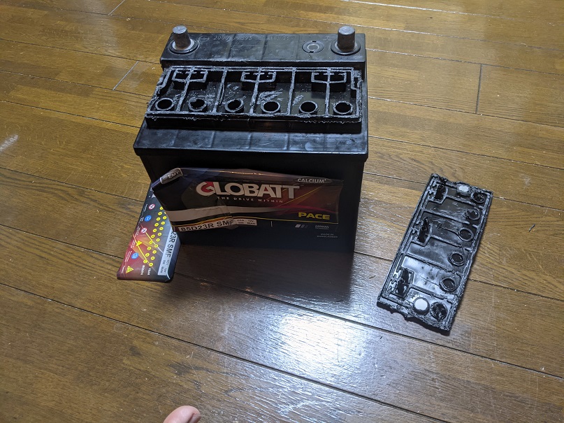 さて、この古いバッテリーだが、メンテナンスフリーのシールドバッテリーのため、補水不要となっている。でもパナのカオスとかはメンテナンスフリーでも補水できる仕組み(延命可能)になっているので、このGLOBATTも延命を試みた。