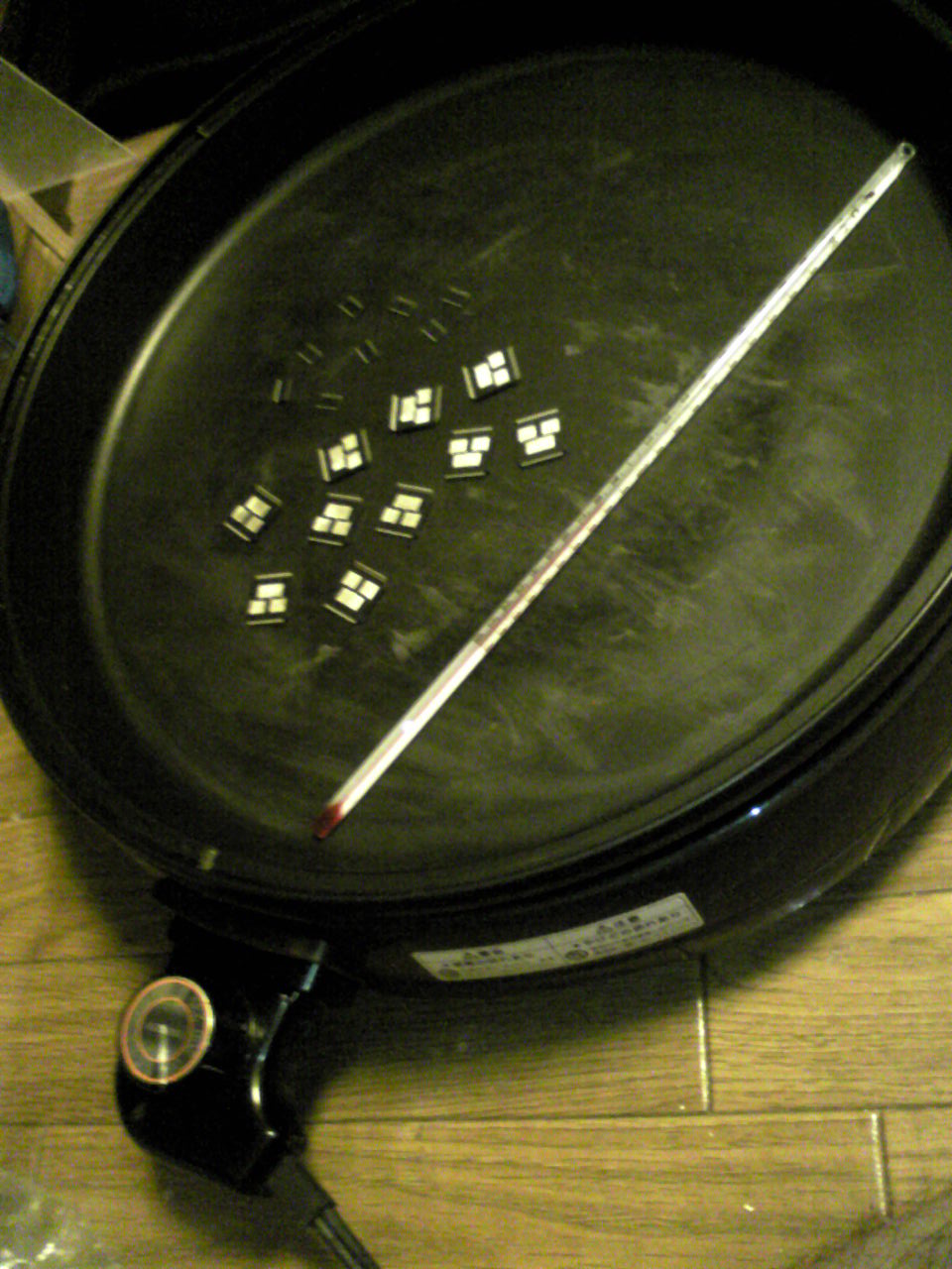④でも800Wなので火力が弱い。設定次第ではリフローの温度曲線についていけない。実質8分でリフローするため、リフロー曲線を5分に縮めたところ、工程は8分ちょっとで収まったものの、実際の温度が曲線に追いつけない。温度が上がりきる前にクーリングが始まる。