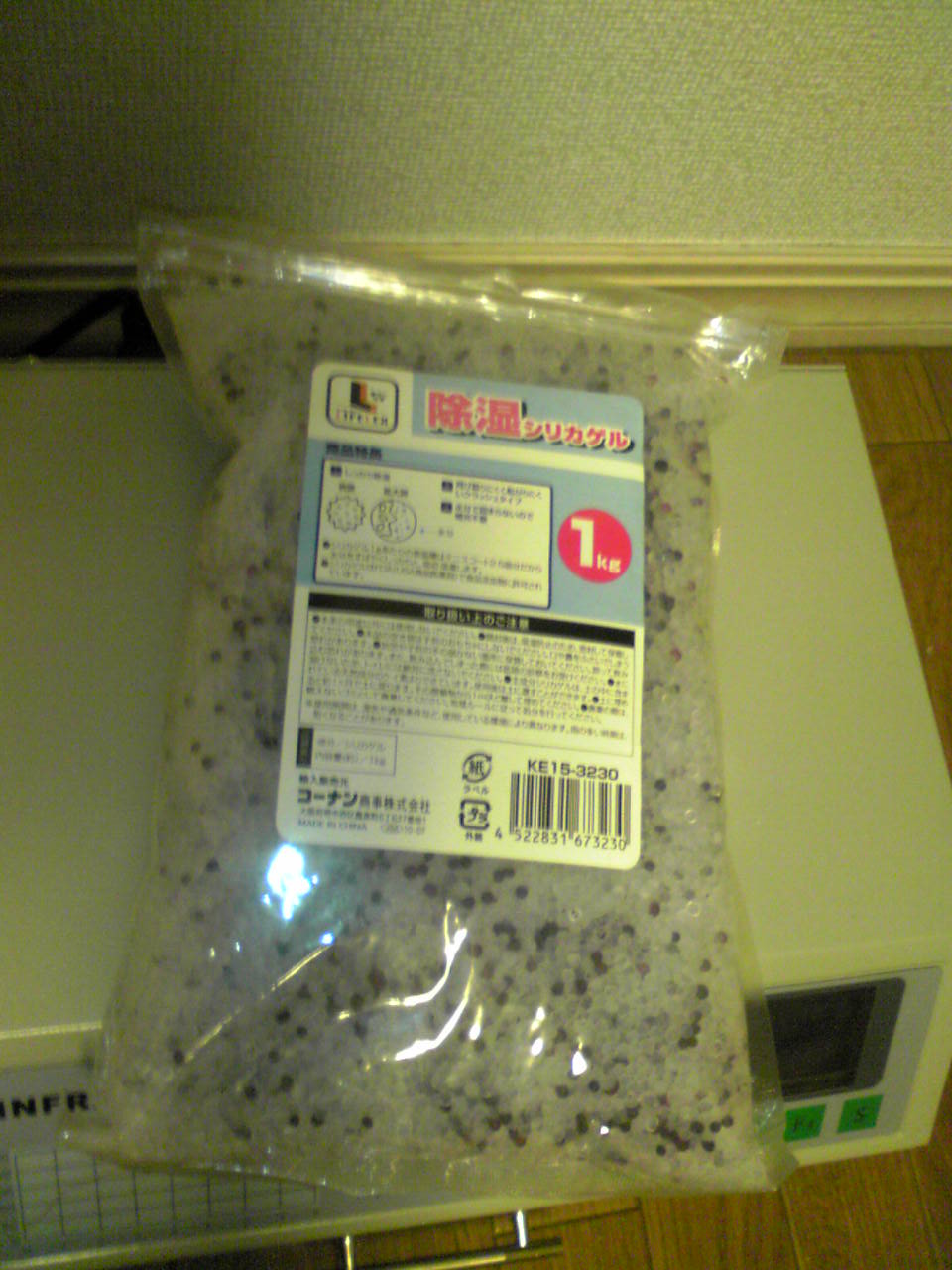 これを100枚100円の紙製お茶パックに詰め込んで、unix wareの中に湿度計付き目覚まし時計とともに入れた。指し示した湿度は30%。室内の湿度は67%なので、かなりシリカゲルは効いているらしい。