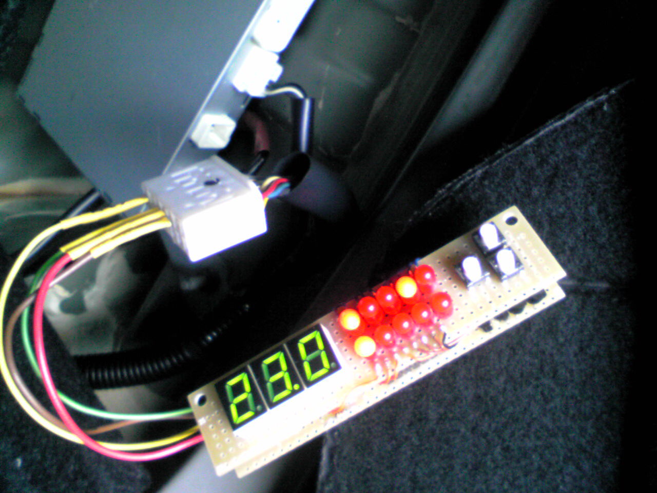表側のパネルも加工した。羽化したてのカブトムシの羽の色したスイッチは、文字を消すために耐水ペーパーでこすった結果。レタリング文字でも入れようと思って20年ぶりにレタリングシートを買いに言ったら、どこにも売ってないので諦めたので、真っ白なまま。左側のボタン2つは撤去して、この前作ったエアコン表示器を埋め込み。
