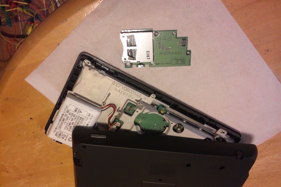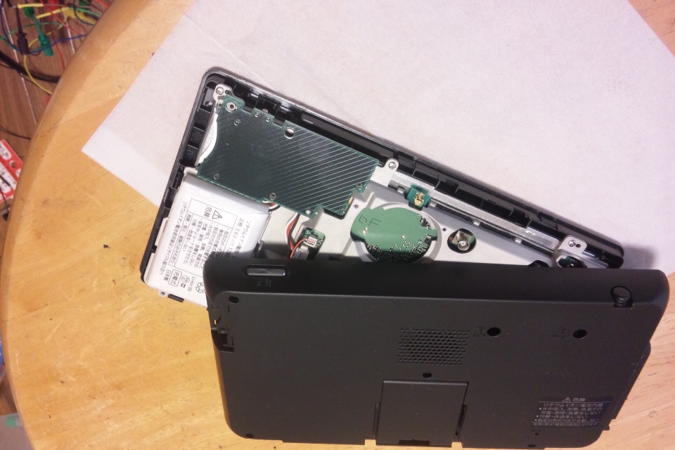 まずは分解だ。分解方法は、なんと取り扱い説明書に書いてある。とはいってもリチウムイオン電池廃棄のための分解であり、それ以外に分解しちゃだめと書いてあるが、まあ気にしない。ただ、書いてあるとおりにやってはいけない。マイナスドライバーを差し込むと、ガワが割れる。ツメを隙間に入れて、ゆっくりと開いていくこと。