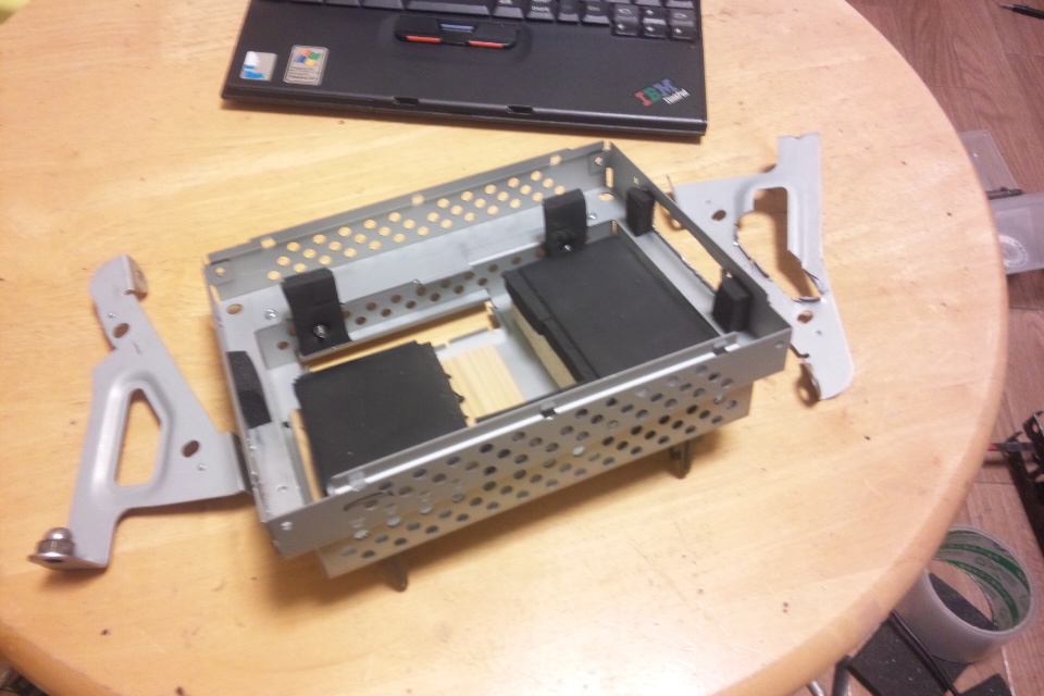EMVの骨組みは、そのまま流用。電源コード、VICSケーブル、SDカード延長ケーブルが刺さらないので、要加工。軟鉄なので、のこぎりでサクサク切れるが、電ノコがないとさすがに厳しいだろう。手切りなら、10時間程度は覚悟するべし。あとは適当に木片やゴムとか貼り付けて、位置あわせ。うーん、鉄で囲んで、シールドもばっちり。これなら電磁化対策も万全!備えあれば憂いなし。すばらしい。