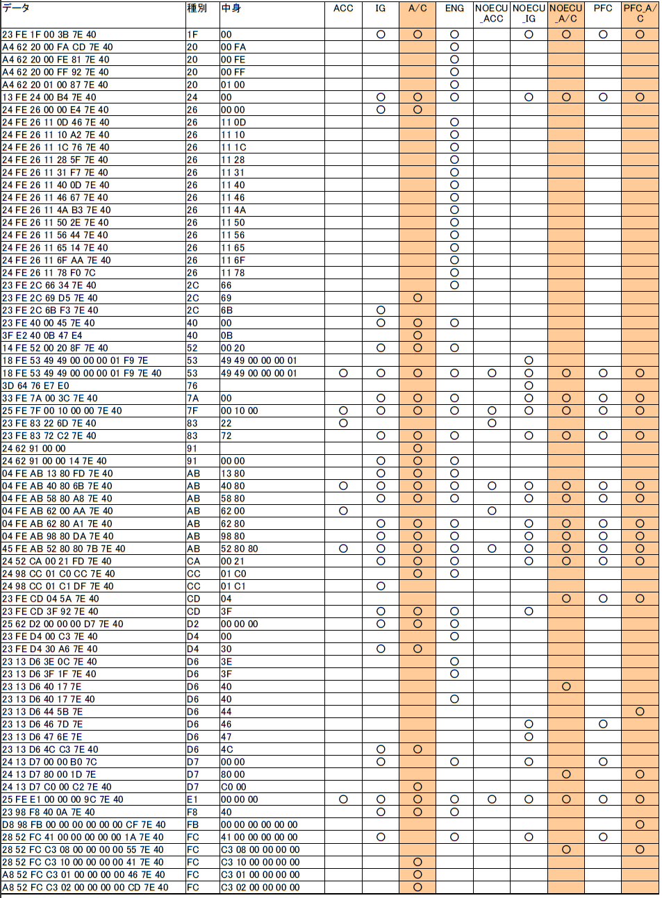 まずはキャプチャー結果。アクセサリーON、エアコンON、エンジンを止めたor動かした状態、ECU外した、パワーFC付けた、などいろいろな状況で試した。