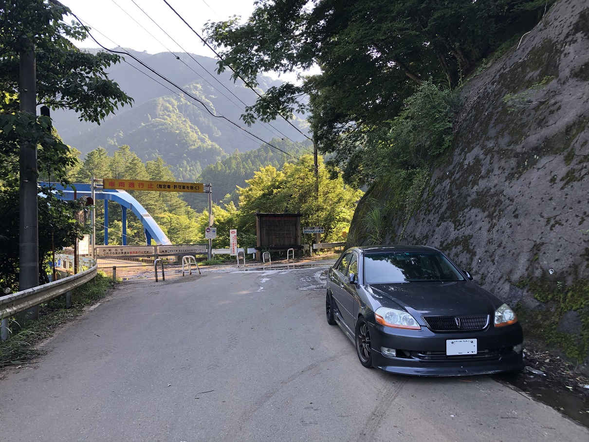 先ほどの駐車場から50mぐらいのところに車を停めた。林道の入り口(早戸川橋のところ)は施錠されていて、車両侵入禁止になっているが、歩行者は問題ない模様。自転車も時々通っていたので、自転車は車両にあたらないのかもしれない。