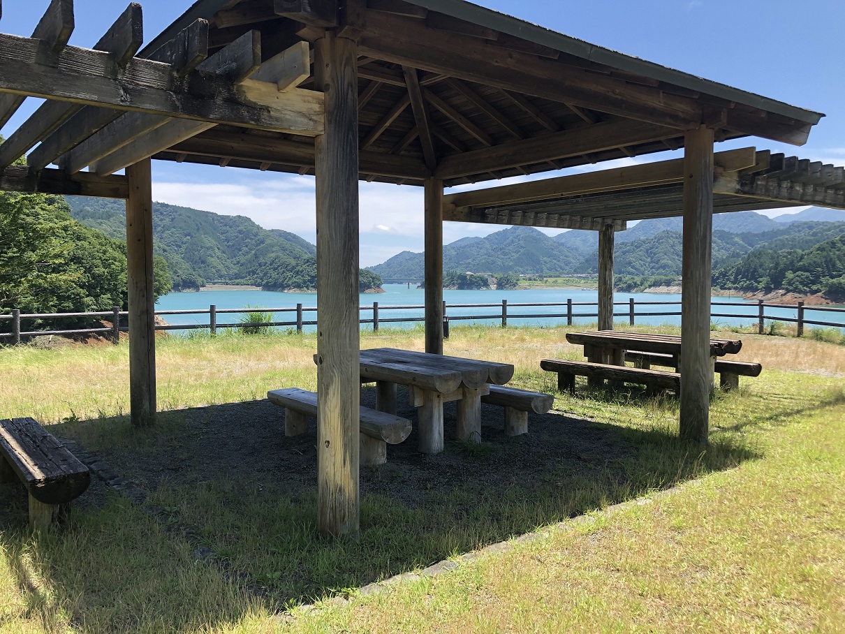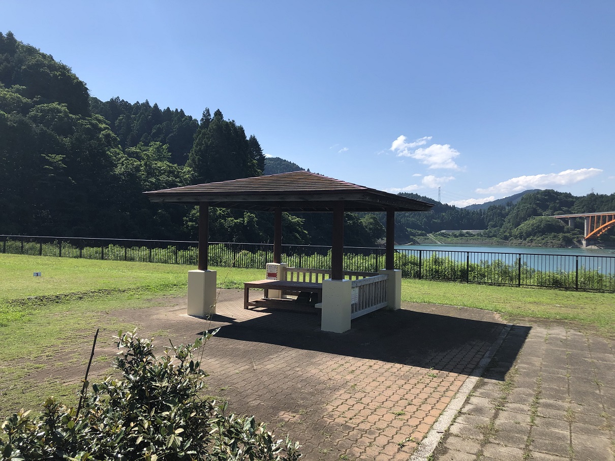 パターゴルフ場横に、湖畔のあずま屋があった。綺麗な感じで管理が行き届いているのがわかるが、やはり平日は無人である。