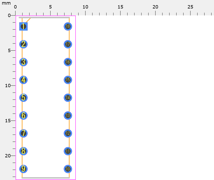 一応、PCB Library Loader経由でダウンロードしたものを使ってみたが、こちらは、まあまあな感じだった。ただ、ときどき、とんでもないクソが混じっているので、過信は禁物。例えばPIC16F84AのDIP版はPIC16F84A-04/PとPIC16F84A-20/Pがあるが、PIC16F84A-20/Pのフットプリント(↓)なんて、悲惨だ。。。