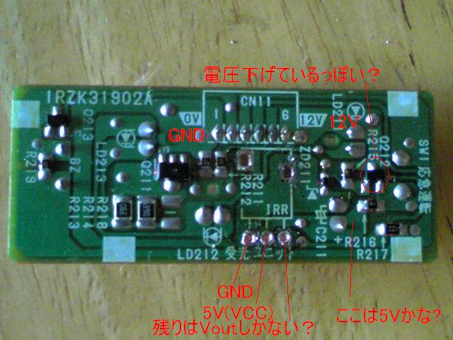 VCC (5V) が見つからないが、12V があるので、ここからたどっていけばいい。