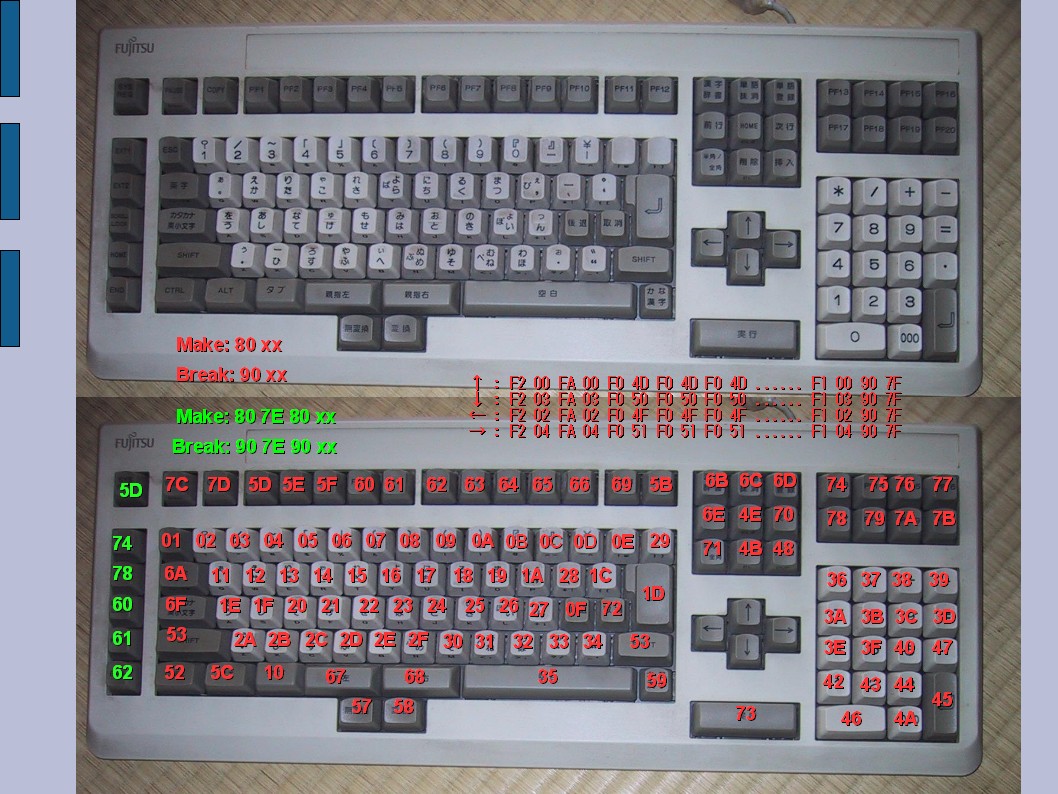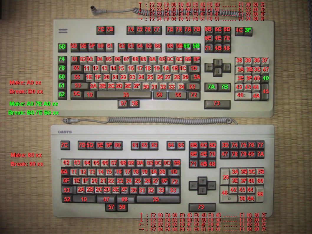 OASYS ... Make:80 xx Break:90 xx、All key released:90 7F、カーソルキーを除き2バイトコード
