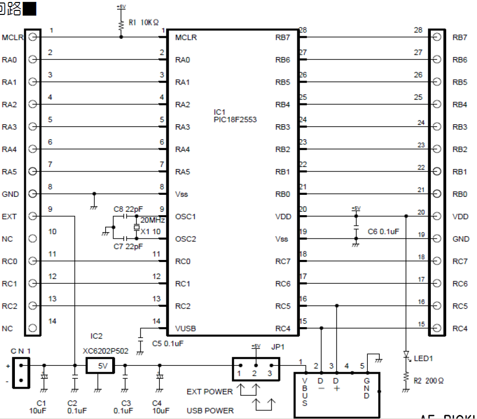 まず、PIC18F27J53を使って下記のような回路を作った。